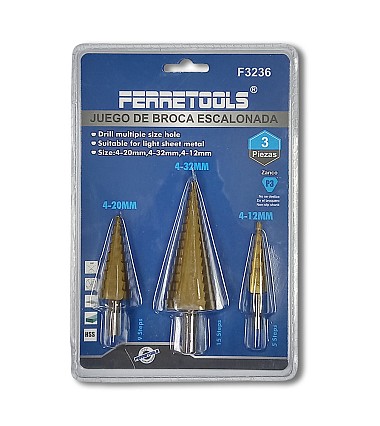 Set De Brocas Escalonadas 3 Piezas (4-12/4-20/4-32) FERRETOOLS,está diseñado principalmente para realizar perforaciones precisas y limpias en diversos materiales delgados, como chapas de metal, plásticos y perfiles.