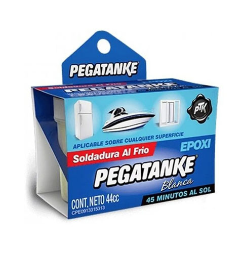 El pegatanke blanco es uno de los pegamentos más fuertes del mercado. Es una resina epóxica compuesta por dos componentes diseñados para resistir en las condiciones más adversas. Posee la cualidad de secar incluso debajo del agua. Ampliamente utilizado en el ámbito industrial y en el hogar gracias a su gran dureza, resistencia térmica, fácil manipulación y excelente efectividad. Ideal para reparar embarcaciones, neveras, tuberías, tanques de gasolina, tanques de agua, radiadores, reparación de objetos plásticos, metal, madera, cerámica, fibra de vidrio, vidrio, aluminio, entre otros. (Mezcla los dos componentes en partes iguales durante 3 minutos, raspa las superficies a reparar, aplica y moldea hasta cubrir la superficie dañada, mantén las piezas durante 45 minutos al sol o 1 hora y 45 minutos a la sombra (tiempos pueden variar según el clima). Se recomienda esperar 24 hrs para alcanzar su máxima dureza).