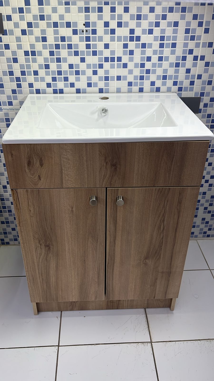 Este Mueble Vanitorio Café 81 x 61 x 47 cm con Cubierta, está fabricado con material PVC de alta calidad, con un acabado brillante. Cuenta con correderas telescópicas en sus tres cajones, bisagras de acero inoxidable y tiradores metálicos de color negro. El lavamanos es de loza, ofreciendo durabilidad y fácil limpieza.