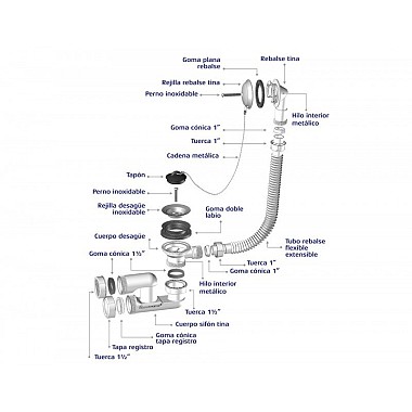 Desagüe Tina 1 1/2 C/Rebalse y Sifón es un kit de gasfitería diseñado para gestionar la salida de agua en bañeras estándar. Su función principal es conectar la tina a la red de alcantarillado, evitando desbordamientos y el retorno de malos olores.