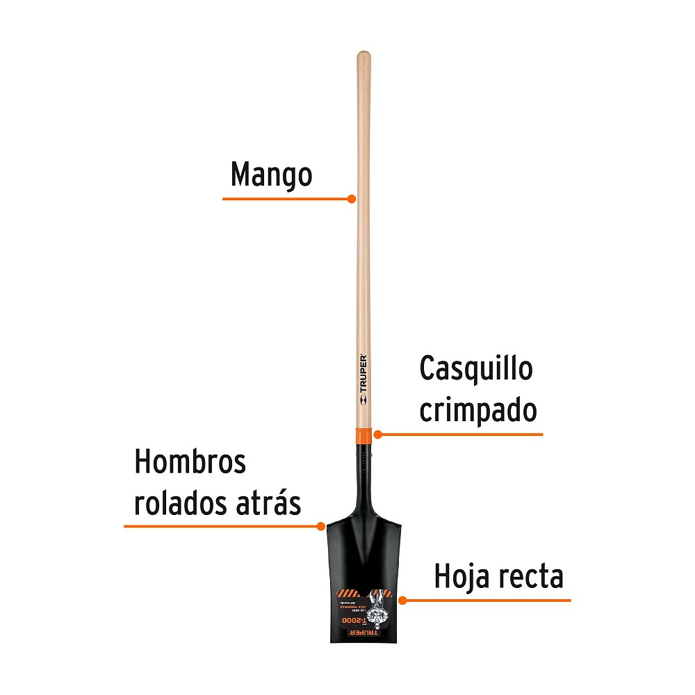 Pala Escarrama M/Largo PES-LP Truper. Es una herramienta especializada diseñada para excavación profunda, apertura de zanjas estrechas y remoción de raíces en suelos de diversas condiciones.