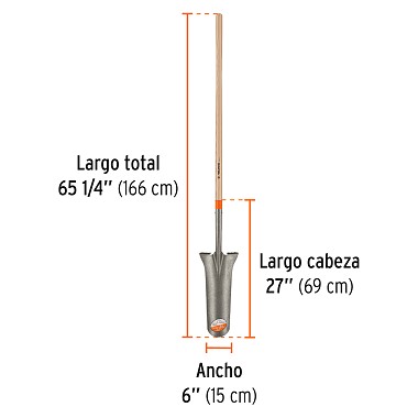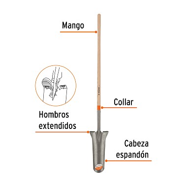 Pala Espadón Truper Mango Largo PEP-16L. Está diseñada para cavar zanjas, excavaciones profundas y cortar raíces. Su diseño estrecho y largo la hace ideal para trabajos que requieren penetración eficiente en suelos compactos, siendo útil en tareas de jardinería, agricultura y construcción.