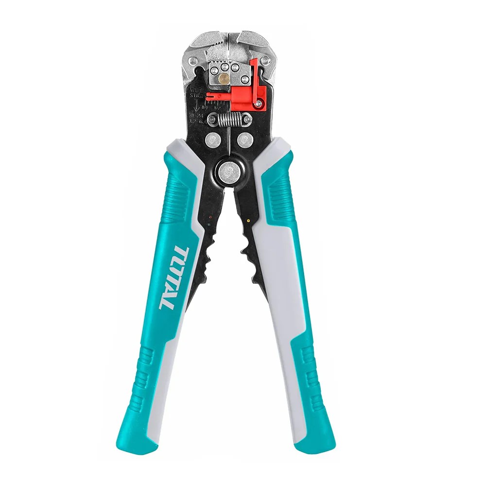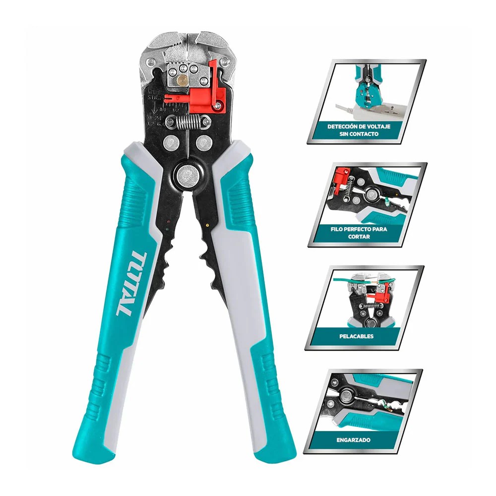 Alicate Pelacable Automático Total, es una herramienta multifuncional 4 en 1 diseñada para pelar, cortar, crimpar cables y realizar detección de voltaje sin contacto. Su función automática ajusta la presión a diferentes calibres de cable para un uso eficiente.