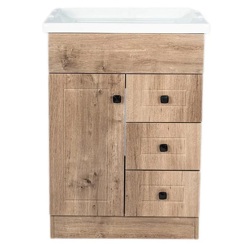 Este Mueble Vanitorio Café 81 x 61 x 47 cm con Cubierta, está fabricado con material PVC de alta calidad, con un acabado brillante. Cuenta con correderas telescópicas en sus tres cajones, bisagras de acero inoxidable y tiradores metálicos de color negro. El lavamanos es de loza, ofreciendo durabilidad y fácil limpieza.