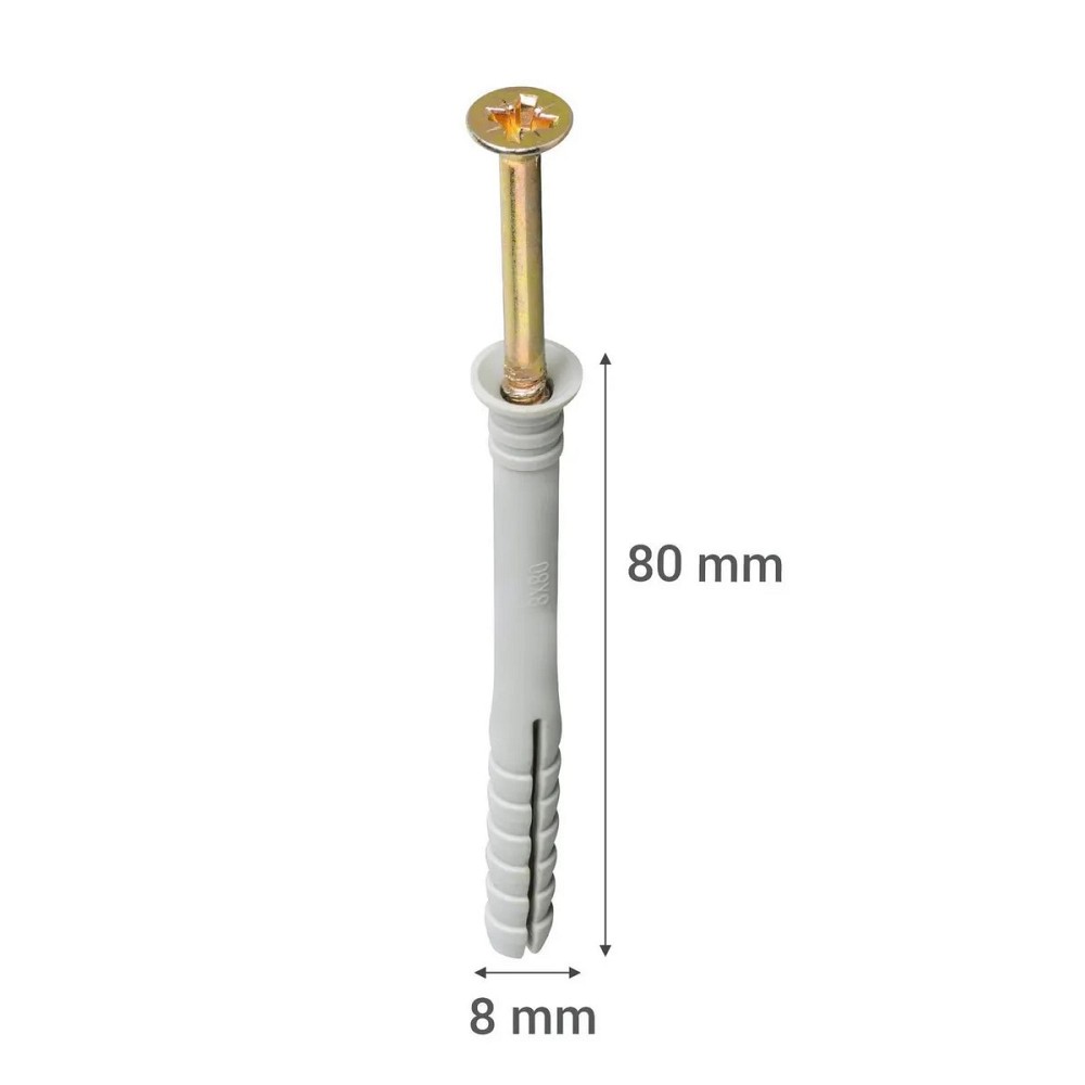 El Tornillo C/Tarugo 3 pulgadas 8x80, se usa como fijación mecánica diseñado para anclajes de carga media-alta en superficies sólidas. Para instalar marcos de puertas y ventanas, o para fijar maderas y metales a superficies de concreto, ladrillo y bloques de cemento.