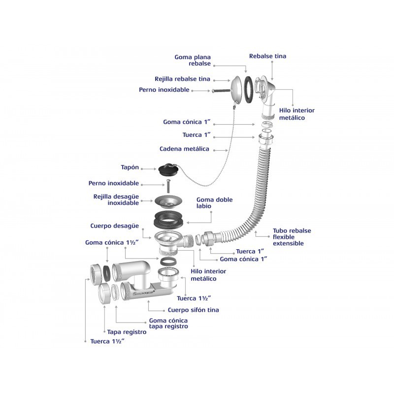 Desagüe Tina 1 1/2 C/Rebalse y Sifón es un kit de gasfitería diseñado para gestionar la salida de agua en bañeras estándar. Su función principal es conectar la tina a la red de alcantarillado, evitando desbordamientos y el retorno de malos olores.